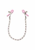 Push sensation to the next level and enjoy teasing nipple play with the Nipple Play Crystal Chain Nipple Clamps; Explore elevated sensation with the 2 fully adjustable nipple clamps, teasing chain and sparkling crystals. Reach new levels of playful pleasure with the adjustable clamps; Clamp the naughty clasps to your body and enjoy every rush of pain and pleasure. The teasing clamp has adjustable tension to stimulate anywhere on your body for playful teasing; As the tension tightens, the tingles intensify with every turn of the dial for the ultimate in nipple stimulation toys. With the teasing clamp stimulation and increased blood circulation, you can look forward to amplifying nipple sensitivity and intensify overall arousal; These easy-to-use nipple teasers are great for him or her. The two adjustable clamps are made from nickel-free iron with silicone cote, an nickel-free iron chain and Silica crystals.