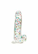 The Naughty Bits I Love Dick Heart Filled Dong is one heart-on you will love! The playful dong is crafted with a like-feel feel, suction cup base, and sparkling heart confetti design. Deliver the pleasure you’ve been craving with a 6-inch long dong with helmet-top, textured shaft, and life-like balls. The extremely flexible design makes this an extra comfortable ride. The flanged base has a sturdy suction cup that can be used in a harness or mounted to a flat surface for sensation hands-free fun. The Naughty Bits collection is made to stand out in any nightstand with eye-catching designs and orgasmic features. The ultra plush material and playful of this naughty dong will make even the most stylish lover smiling before and after.